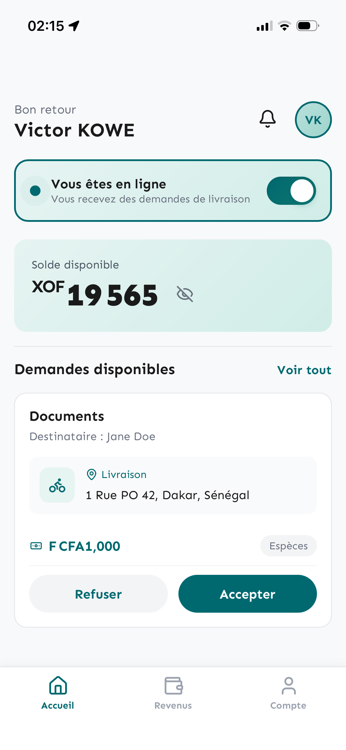 Un livreur disponible à proximité accepte votre course en quelques secondes.